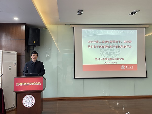 2025年1月3日上午,苏州大学唐仲英医学研究院2024年度领导班子、领导干部考核工作会议在学术报告厅顺利召开。唐仲英医学研究院孙庆民书记、戴克胜副院长(主持工作)及全体教职工参加了大会,大会由孙庆民主持。